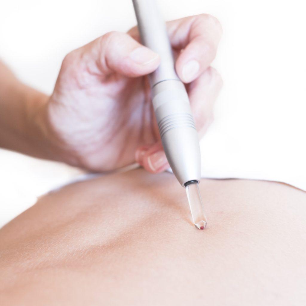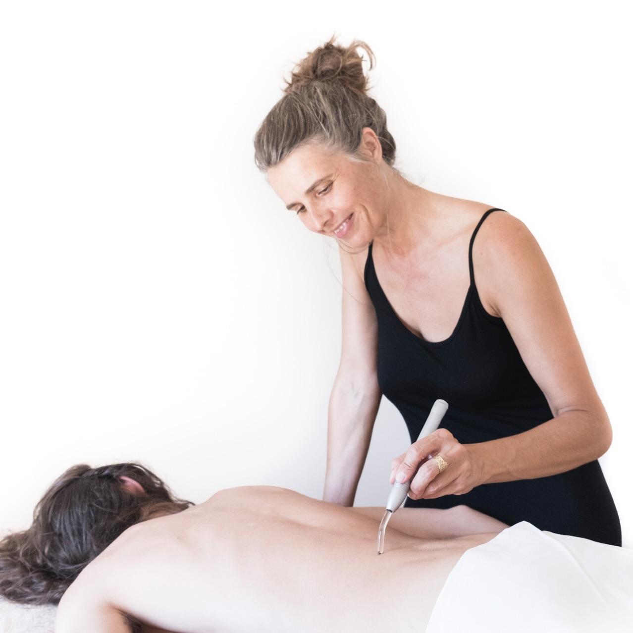 Un stylo lumineux muni de fines tiges de verre coloré est posé délicatement sur des points précis du corps — des points issus de la cartographie des méridiens de la Médecine Traditionnelle Chinoise, enrichie par les recherches de Peter Mandel.